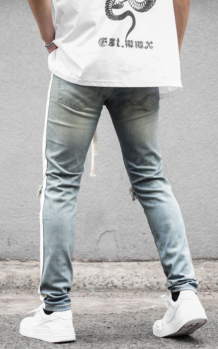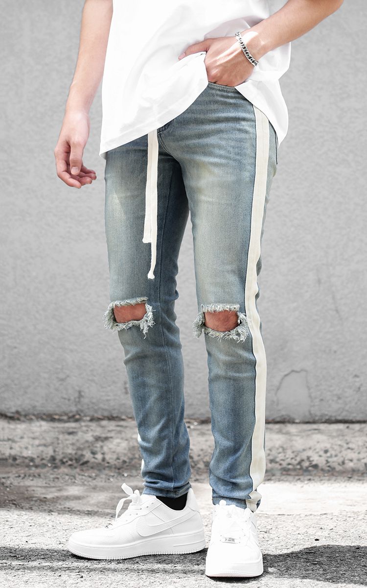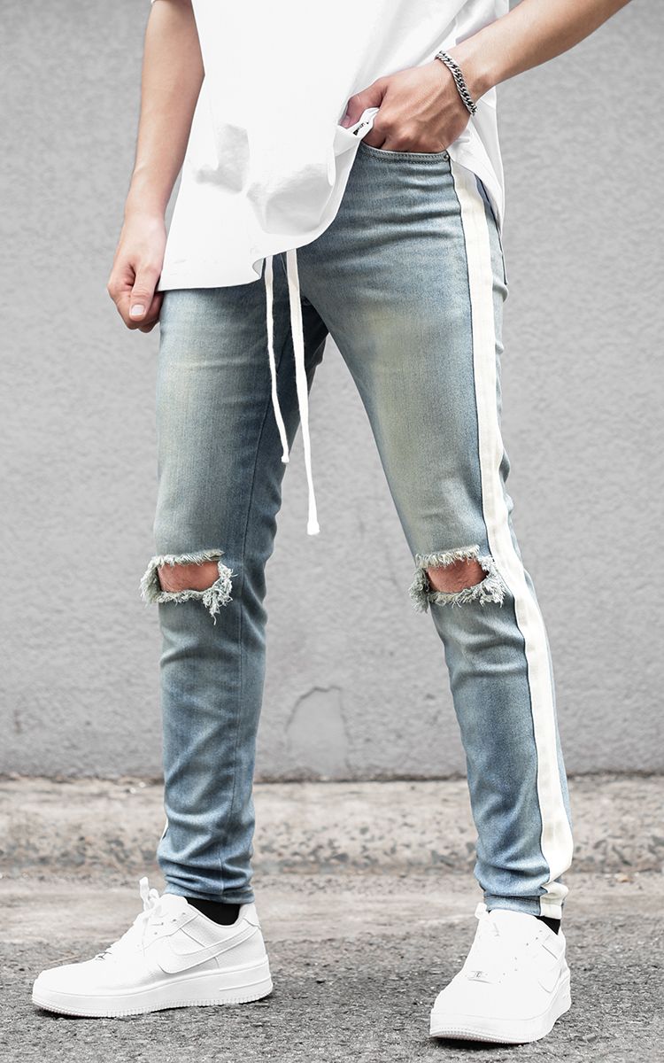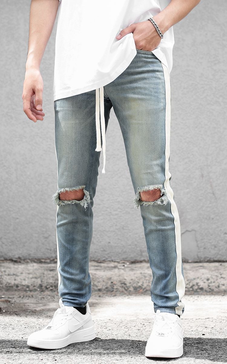 | THÔNG TIN Vải Denim Hai Túi Trước Hai Túi Sau Một Túi Nhỏ Sọc Hai Bên Rách Gối |
